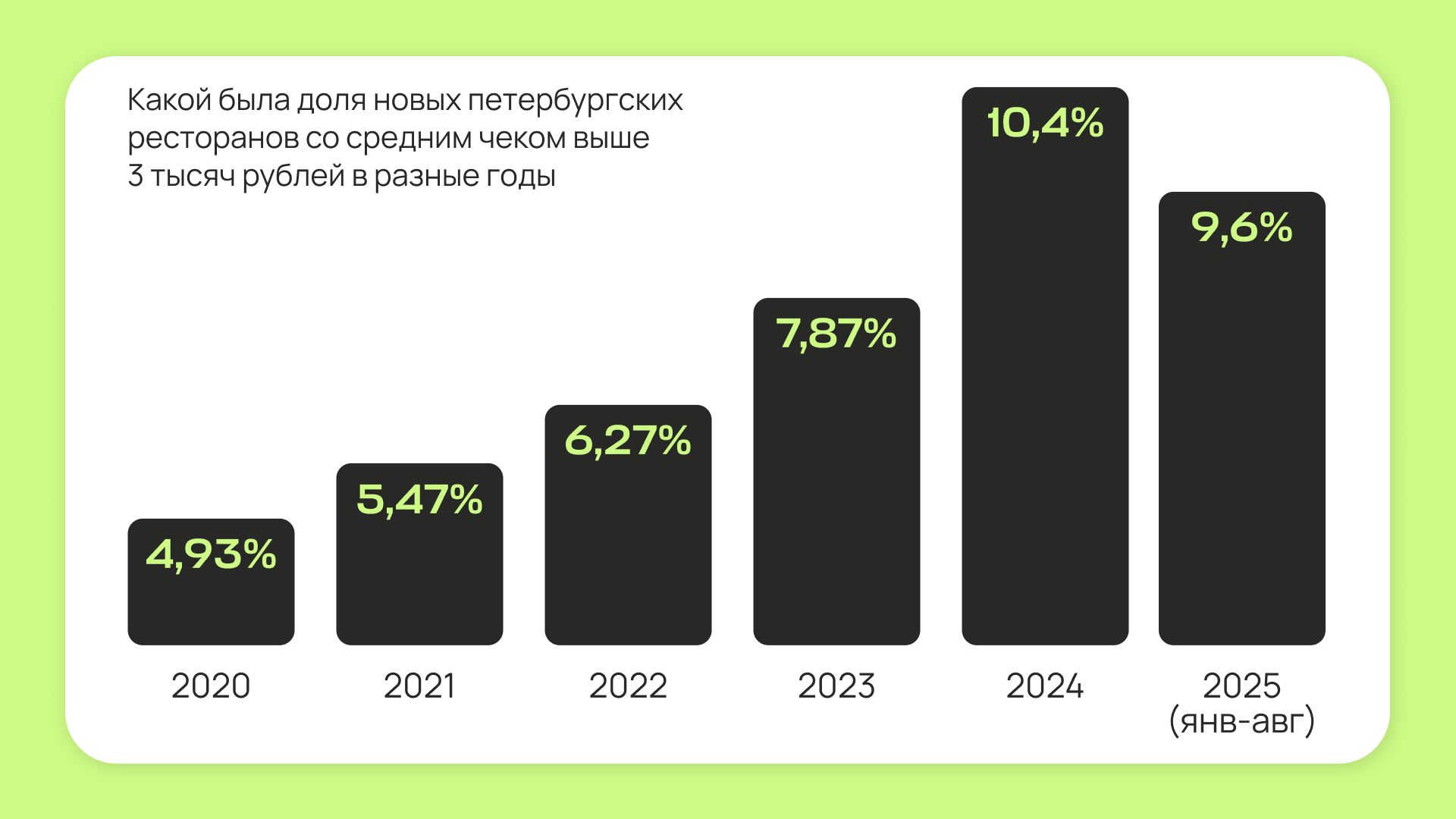 По просьбе «Бумаги» сервис Restorating подсчитал, сколько новых заведений со средним чеком выше 3 тысяч рублей открыли в Петербурге за последние шесть лет (в случае 2025-го — с января по август). Мы обработали эти данные и выяснили, что доля таких ресторанов в первой половине 2020-х годов выросла вдвое — с 5 % до 10 % от общего числа открытий.