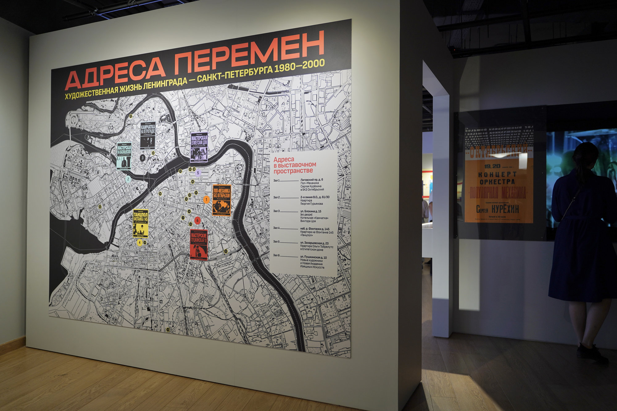 Основное выставочное пространство разместили на нулевом этаже здания. Сейчас здесь открыта выставка «Адреса перемен. Художественная жизнь Ленинграда и Санкт-Петербурга. 1980-2000». Идея проекта — показать на карте города места, где жили и работали знаковые музыканты и художники 1980-2000-х годов.