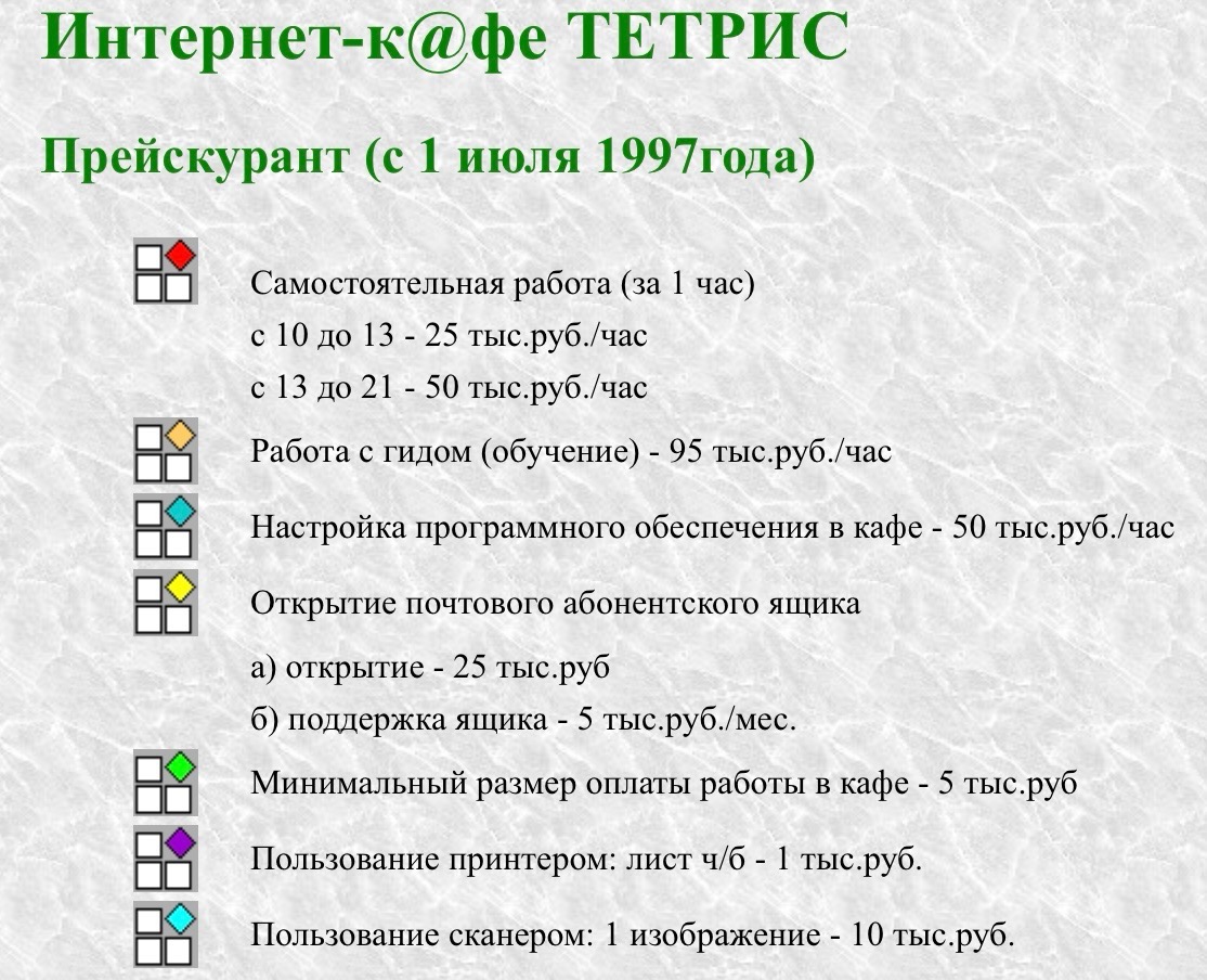 Большинство первых клиентов действительно никогда ранее интернетом не пользовались. Сотрудники «Тетриса» совмещали обязанности администраторов зала и инструкторов по компьютерной грамотности — такая должность в заведении называлась «гид Internet».