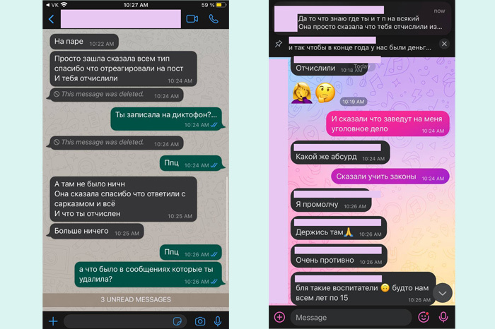 Но за этот пост мою маму вызвали в вуз, хотя она не мой доверитель. Ее отчитали, сказали, что на меня заведут уголовное дело. К тому же замдекана пришла в группу, где я учился, на пару. Она поблагодарила всех за реакцию и сказала: «Мы его отчислили, завели на него уголовное дело. Будем проверять страницу во „ВКонтакте“».