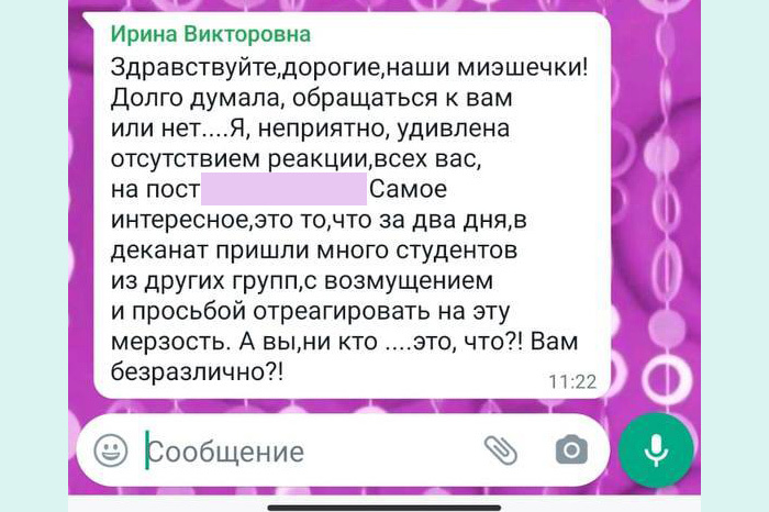 Ранее в беседе с курсом замдекана написала: «Я неприятно удивлена отсутствием реакции всех вас на пост [Богдана]! Самое интересное — это то, что за два дня в деканат пришло много студентов из других групп, с возмущением и просьбой отреагировать на эту мерзость. А вы, никто… Это что? Вам безразлично?»