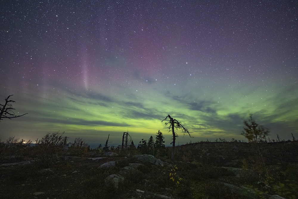 Это свечение видно до 45° северной широты, когда атомы кислорода и азота в верхних слоях атмосферы Земли начинают светиться при взаимодействии с солнечными частицами. Самый распространённый цвет для северного сияния — зеленый, но бывают и красные, и синие свечения, это зависит от высоты столкновения атомов. Сияние видно лишь за городом. Лучше всего уехать на север Ленобласти — например, к Ладожскому озеру, чтобы северная сторона горизонта была чистой.