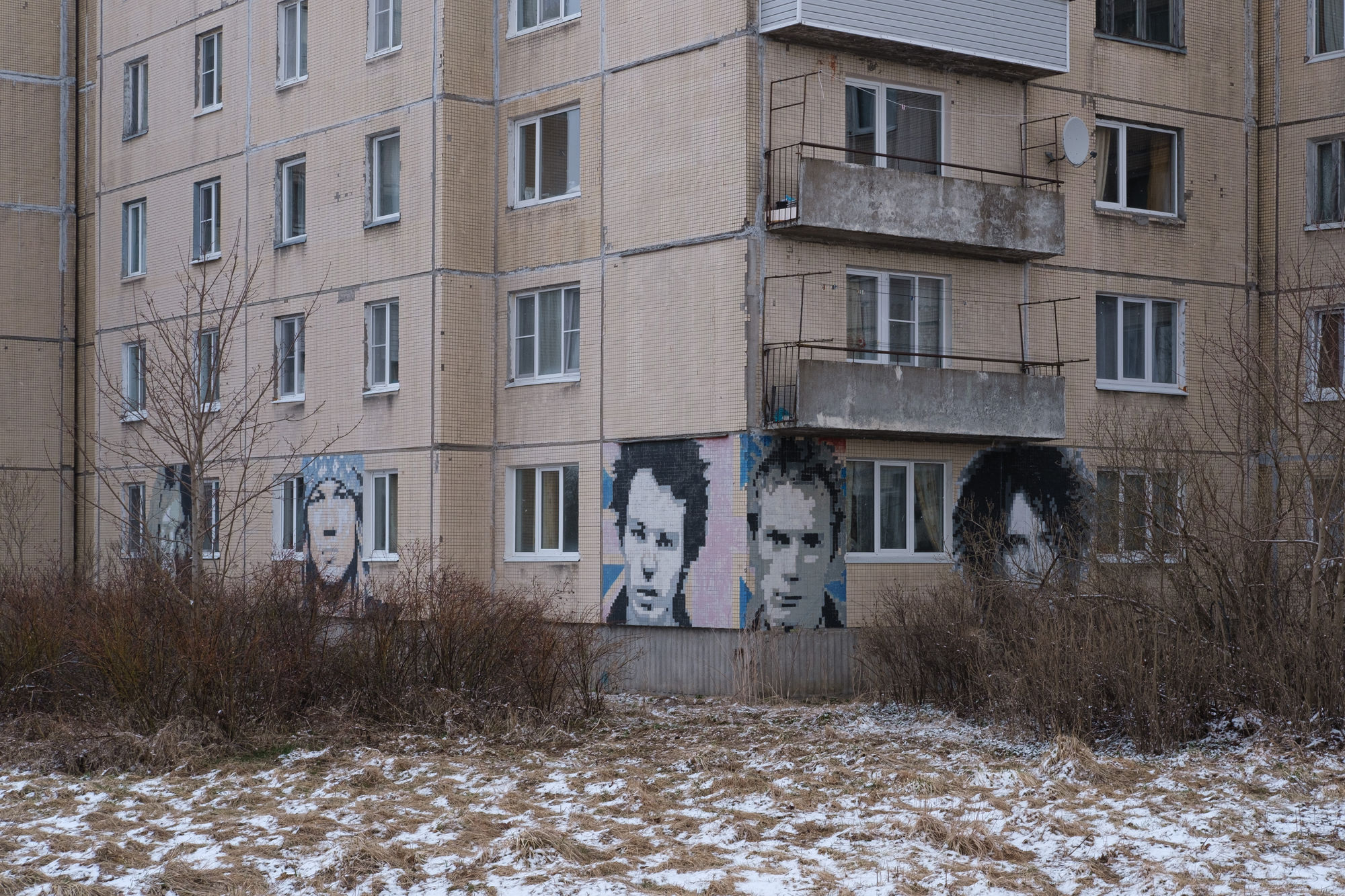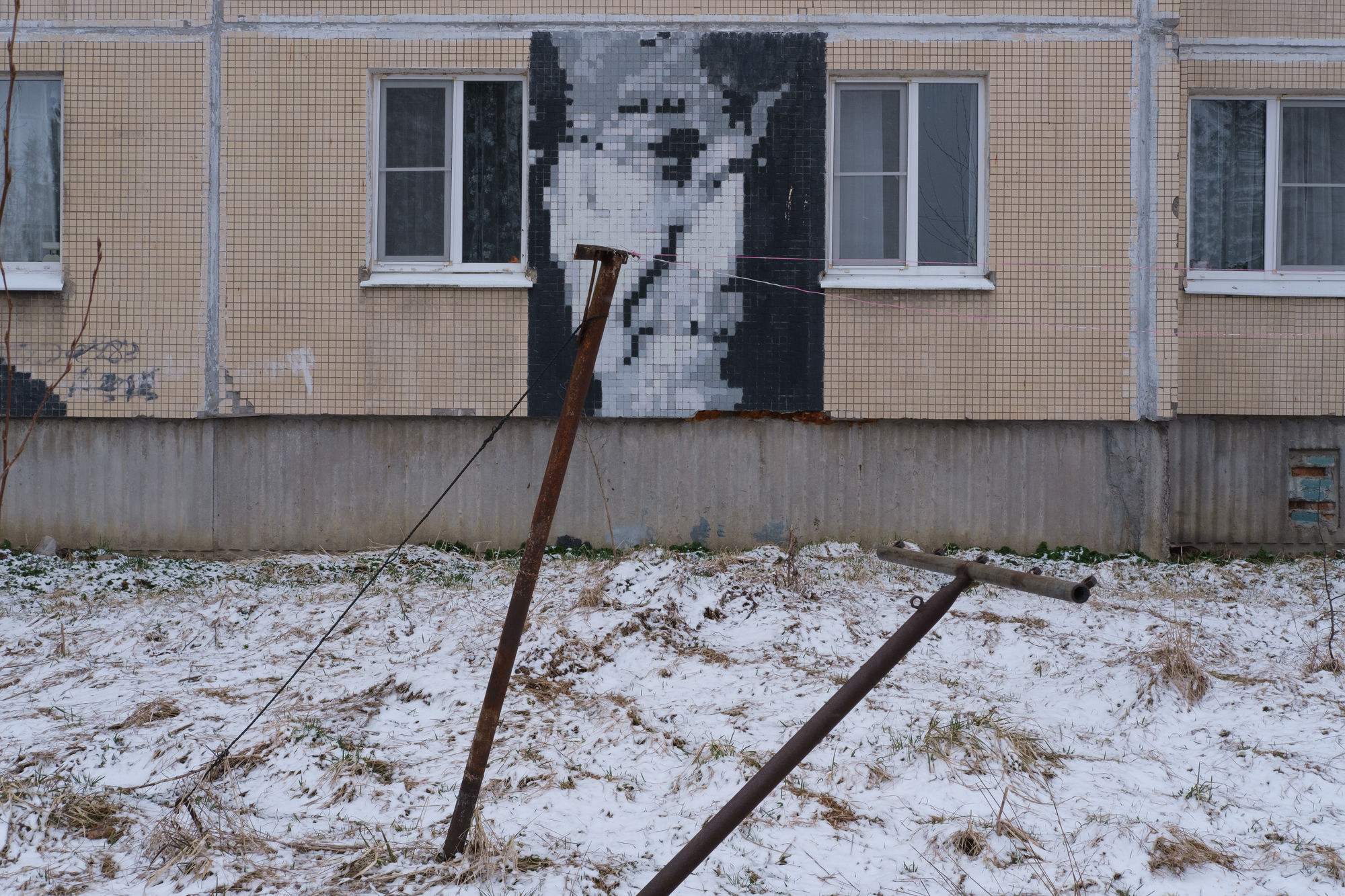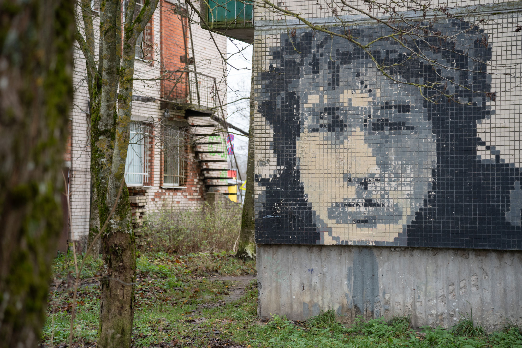 На панельках в Елизаветино — пиксельные портреты Кобейна, Горшка, Хоя и других легенд. Это работы Андрея Гвоздя — бывшего трубочиста Эрмитажа (и панка)