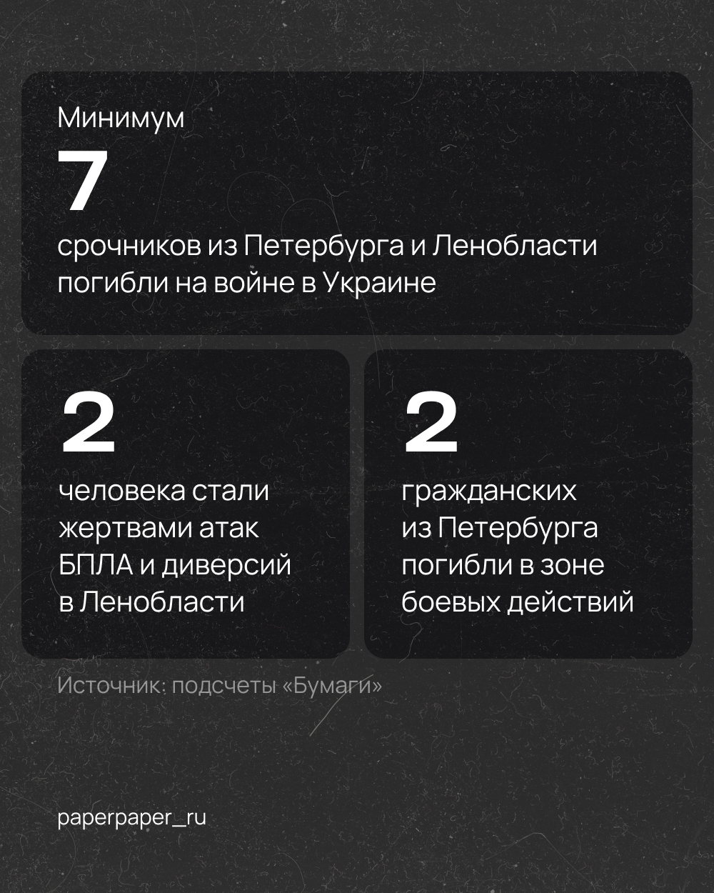 На четвертый год войны из-за диверсий и атак украинских БПЛА жертвы появились и среди мирных жителей в Ленобласти. Во второй половине 2025-го так погибли как минимум два человека. Также «Бумага» нашла информацию о семи погибших срочниках из Петербурга и Ленобласти.