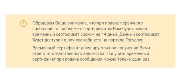 Как сообщают пользователи, при попытке подать заявление о проблеме «Госуслуги» предлагают временный сертификат на 14 дней. «Бумага» убедилась, что это действительно так.