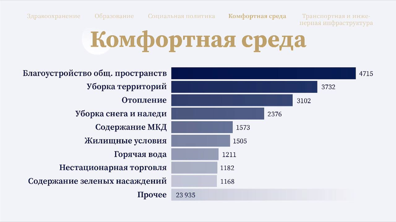 Обсуждать тему «комфортной среды» пригласили ректора Санкт-Петербургской академии художеств имени Репина Семена Михайловского. Перед этим зрителям озвучили число обращений, собранных за год, по теме: на первом месте было «благоустройство общественных пространств» (4715), на втором — «уборка территорий». Михайловский предложил начать со второй темы, потому что она более актуальна, — и связал проблемы с местоположением города.