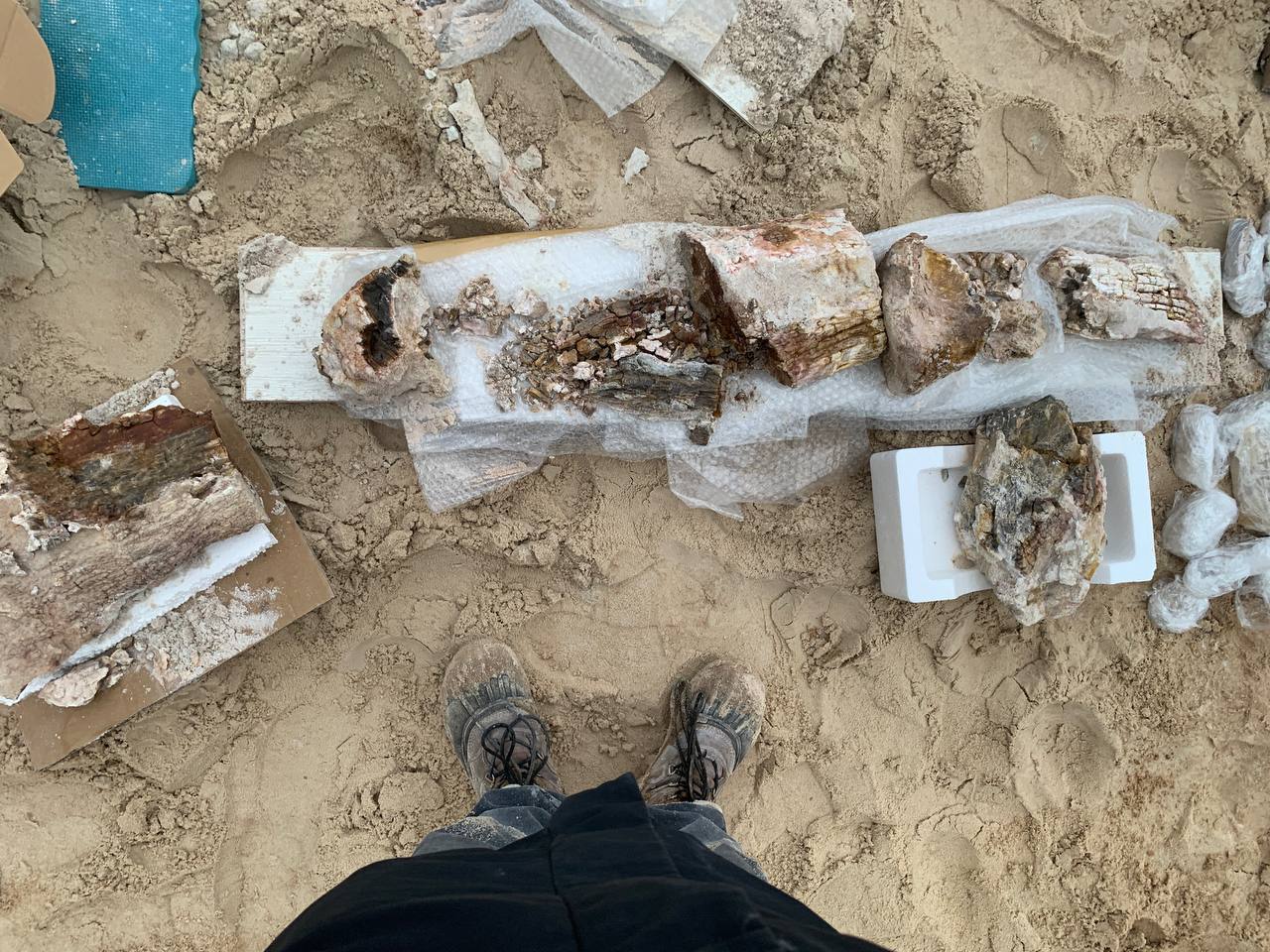 После пропитки окаменелость разбирали по фрагментам, потому что целый пень невозможно достать. Все фрагменты нумеруют, упаковывают в бумагу и подписывают. В процессе очень много фотографируют, чтобы было видно, откуда какая деталь. Потом в машине на небольшой скорости, чтобы не растрясти, везут в университет — там все кропотливо будут собирать, как пазл.