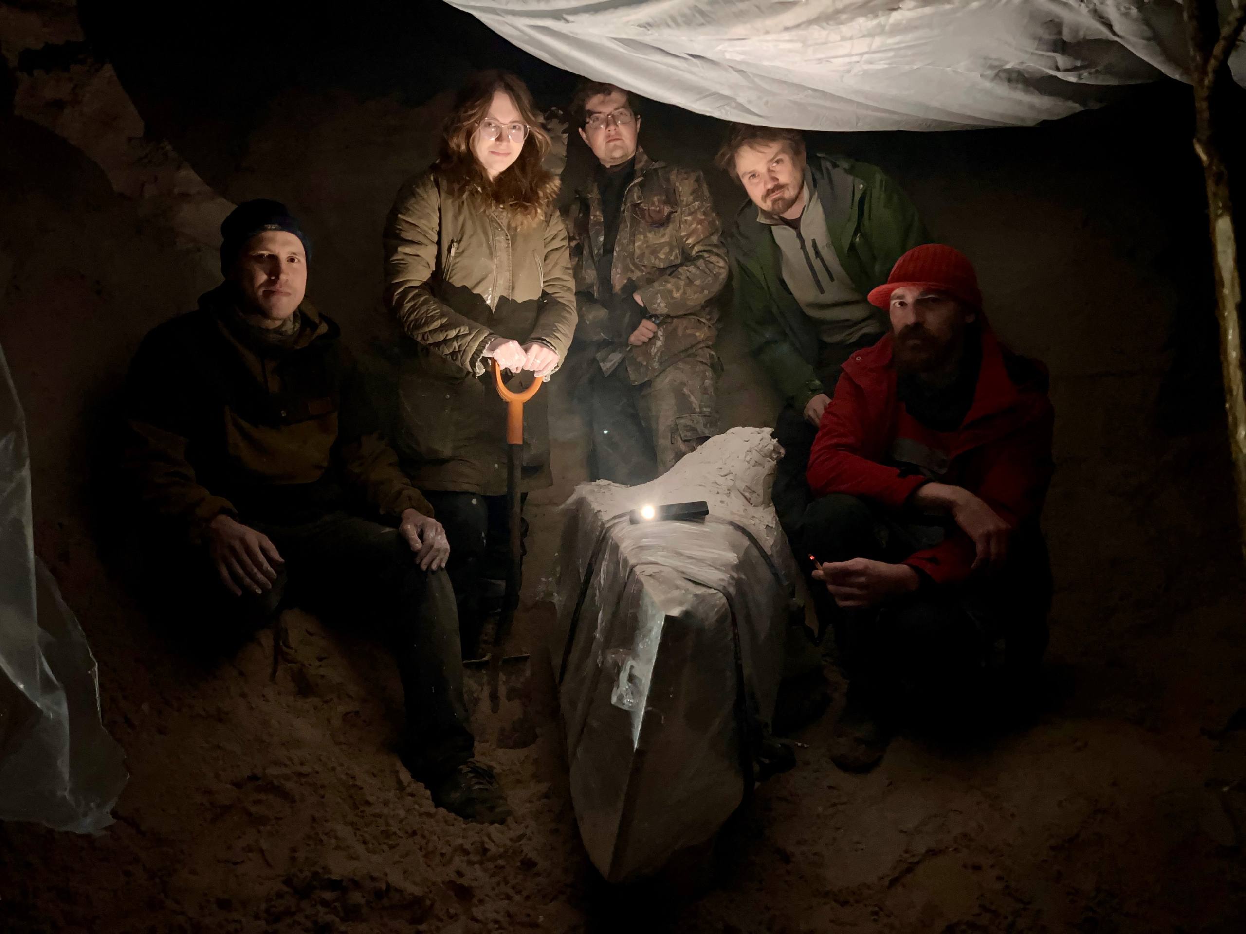 Я заметил, что это явно представляет интерес для науки и отправил фото знакомому палеонтологу Дмитрию Григорьеву, он заведует музеем в СПбГУ. Он подтвердил, что нужно делать раскопки и, будучи настоящим ученым, всё организовал, взял своих студентов и коллег, всю неделю ездил в Лугу и руководил раскопками. Всего было задействовано около десяти человек — они периодически сменяли друг друга. Я тоже ездил как волонтер — помогал и с удовольствием махал лопатой.