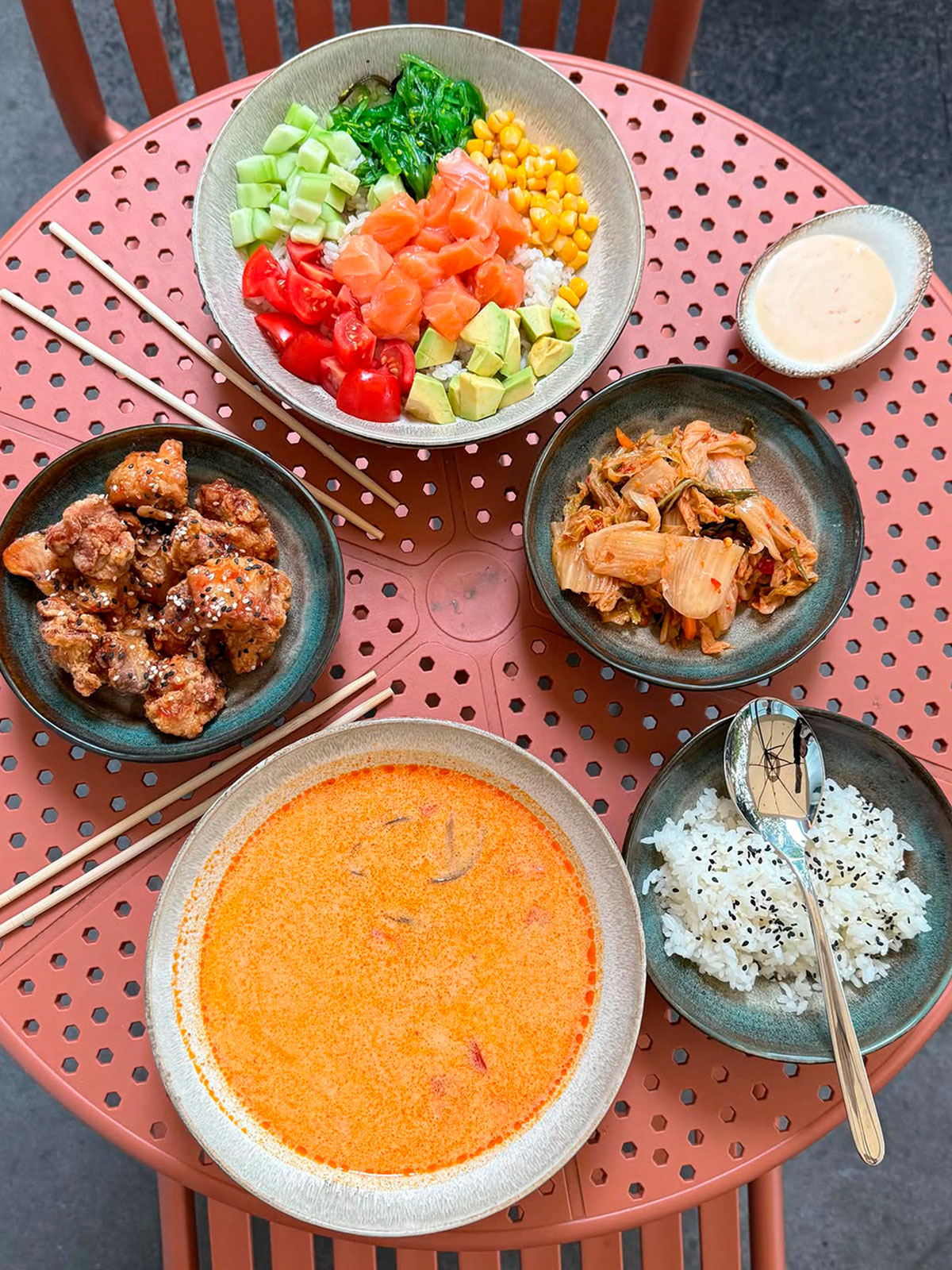 Что заказать: боул с креветками и манго — 39,20 лари, боул с лососем и крем-сыром — 37,60 лари.