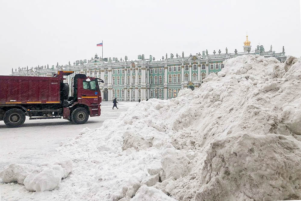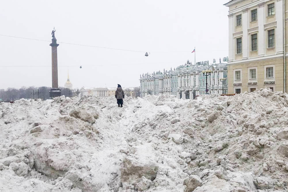 Показываем три фотографии снежных гор, закрывающих вид на Эрмитаж.