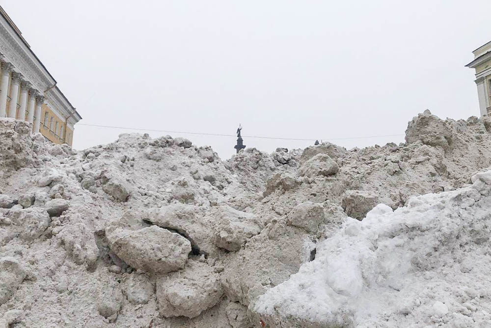 Рядом с Дворцовой площадью, на выезде на набережную Мойки, минимум с 30 ноября лежат горы снега. К 3 декабря они сохраняются.