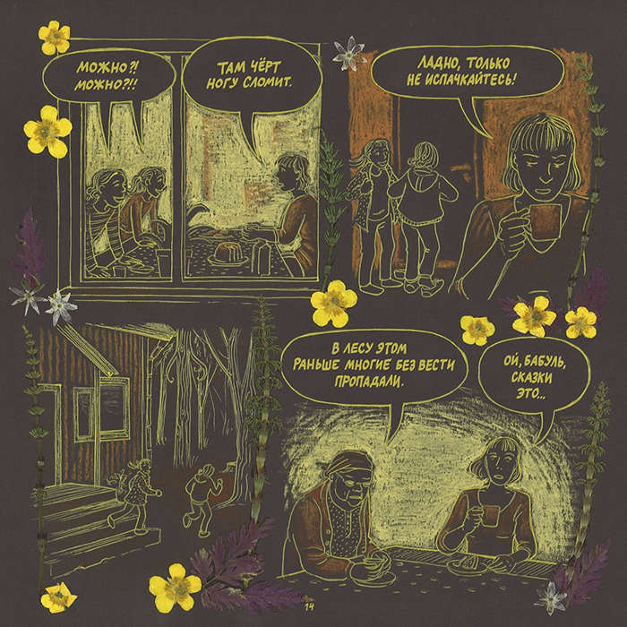 ИА: Они все разные, на них построена часть сюжета. Например, в первой главе — о неизвестном, большом, затягивающем, магическом лесе, где теряются дети. Это то, что есть почти везде (в любой культуре — прим. «Бумаги»). Дети любят играть в лесу, «колдовать» там, но старшие говорят, что это опасно. Другая история — «Карсикко» — о гражданской войне в местной деревне, где для убитых ставили общие памятники-карсикко (из хвойных деревьев — прим. «Бумаги»). В истории о дубе есть наша интерпретация мифа о Мировом древе и его связи со звездным небом.