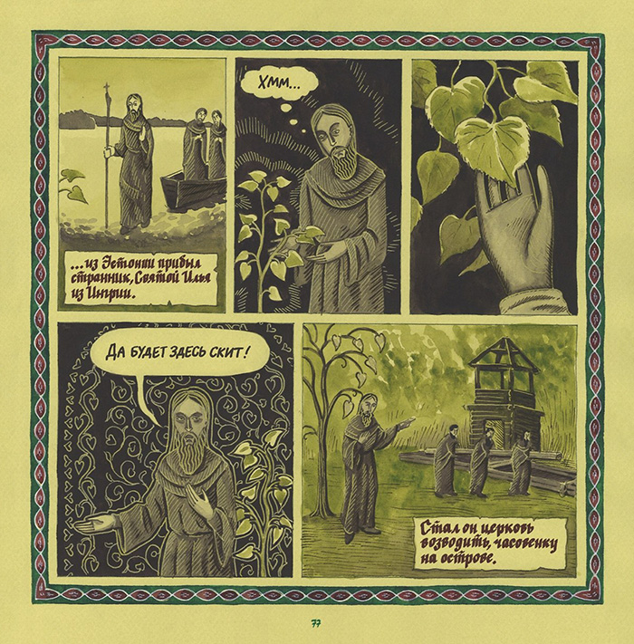 Для книги я много времени проводила в архивах. Искала заговоры, легенды и обряды, связанные с лесом, в древних текстах эпоса «Калевала». К тому же мы общались с экспертами, изучали деревья, собрали очень много материала — и далеко не всё из этого вошло в финальную версию. Например, в комиксе нет целых историй про можжевельник, ягоды которого используют как лекарство, плакучую иву, которая помогает людям минералами и витаминами, черемуху, бузину и многие другие.