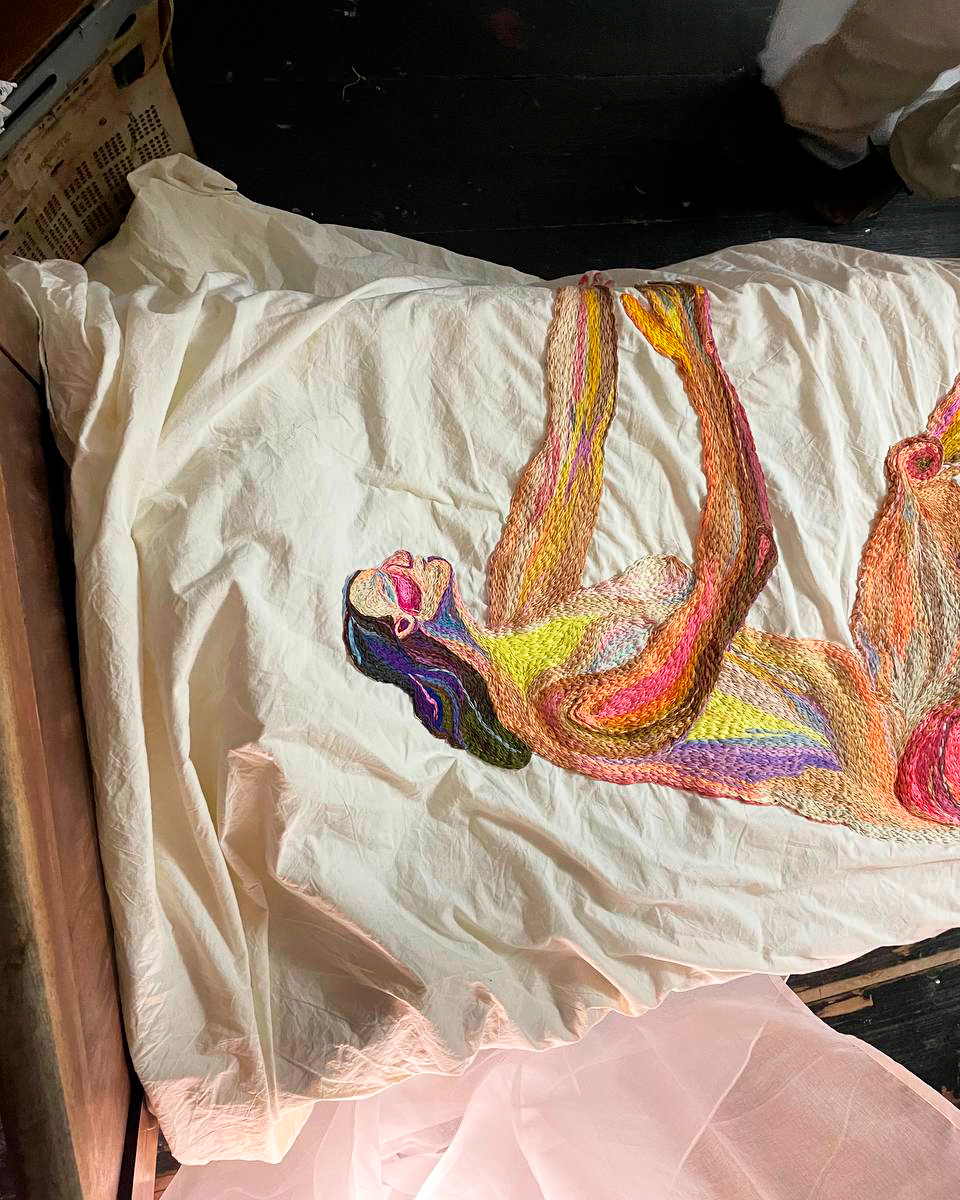 Пространство одного из тбилисских коворкингов на четыре дня превратилось в комнату художницы Ксении Тюленевой, где она вышила свой автопортрет в полный рост. «Это тотальная инсталляция, где ткань, запах, звук и свет создают атмосферу не просто наблюдения, а личного переживания», — сказано в анонсе.