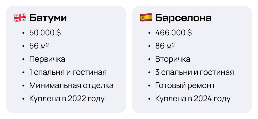 Алла из Барселоны: Раньше на ВНЖ Испании можно было рассчитывать при покупке дороже 500 тысяч евро (примерно 589 тысяч долларов — прим. ред.), это программа «золотых виз». Но в апреле 2025 года ее отменили, так что теперь легализоваться в стране в обмен на инвестиции не получится. В любом случае наша квартира была дешевле, так что про вопрос легализации на основе недвижимости мы с мужем и не думали.