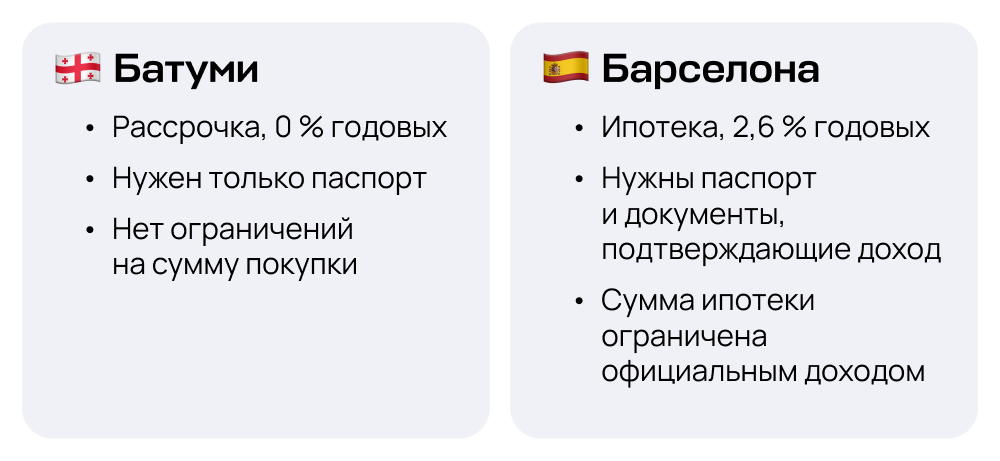 Полина из Батуми: Я привыкла, что в России для покупки квартиры нужно много документов. В Грузии понадобится только паспорт — даже в случае рассрочки. Она беспроцентная, если брать квартиру на этапе котлована. Обязателен первый взнос, обычно около 30 % от стоимости квартиры. Чтобы его заплатить, я просто пришла в банк и отправила деньги с российской карты: в марте 2022-го еще работали SWIFT-переводы из России в Грузию.