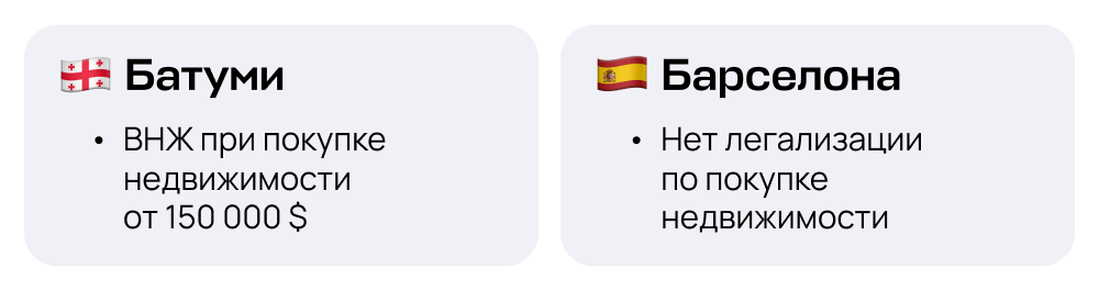 Полина из Батуми: При покупке недвижимости в Грузии можно претендовать на ВНЖ (супруги и дети в таком случае также могут получить ВНЖ — прим. ред.). Раньше для этого рыночная стоимость квартиры должна была начинаться от 100 тысяч долларов, с 2025 года — от 150 тысяч. Но это определяется тем, что сказали во время оценки квартиры: специальный человек приезжает, смотрит на квартиру и дает вердикт.